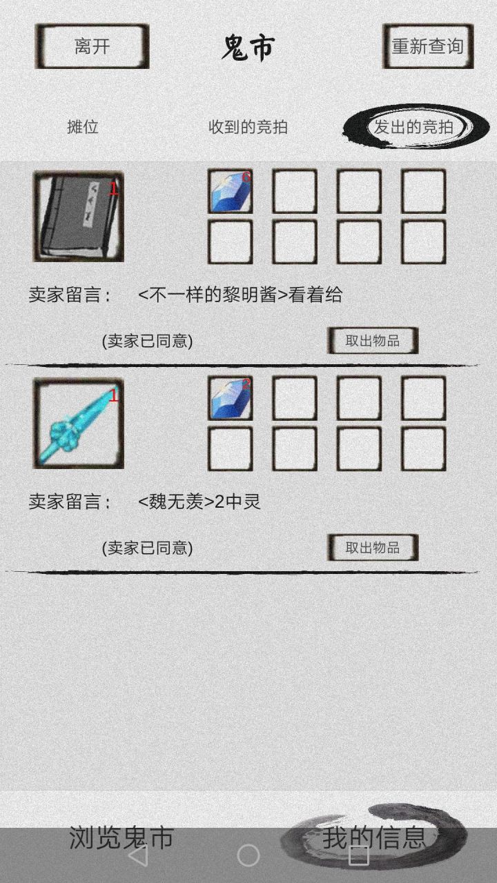 之前玩过这游戏一段时间,玩着玩着感觉单机没啥意思就卸了,后来听说可以自由交易又下了回来,但是想交易还得加群一个一个去问,嫌麻烦就又卸了。建议官方设置一个类似修仙之路里面鬼市的交易市场,卖家挂各种物品并且把想要换的东西在留言里面说明,买家用其他物品来交换,类似下图