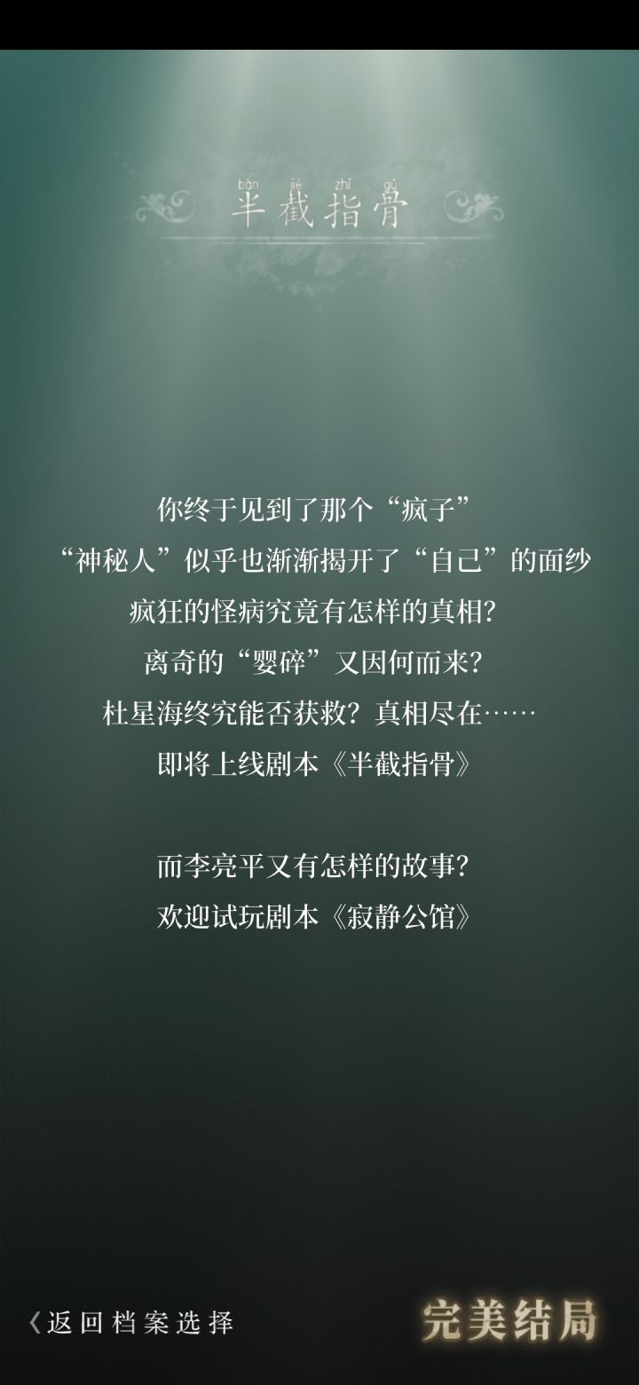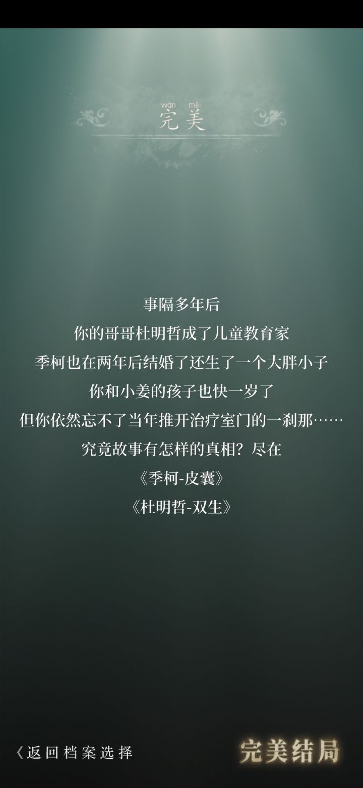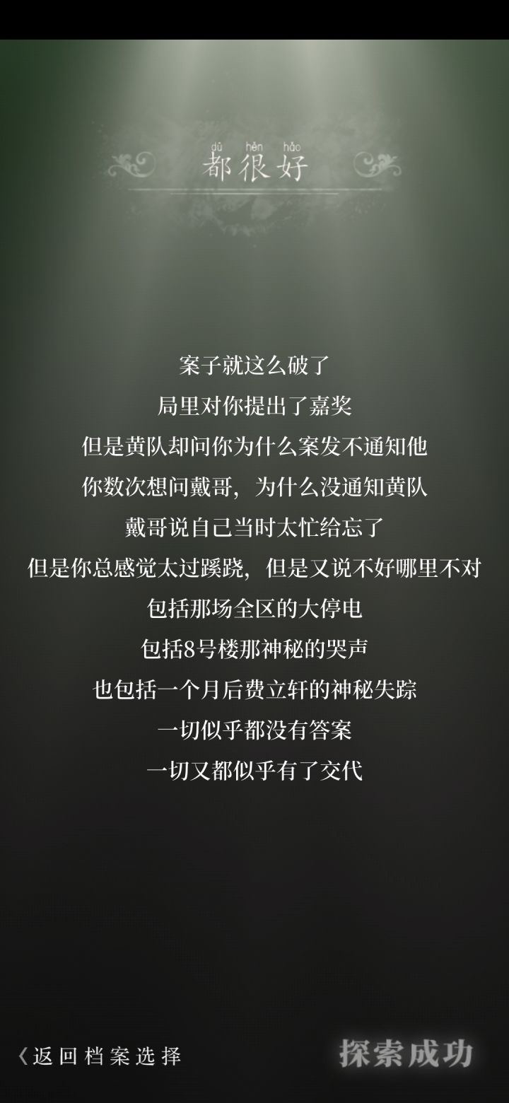 开局先晒一下hhPS:【】里为故事树上的节点,可以直接点击节点跳转来重复刷结局,有些不重要的选项不唯一,可以随意先来完美结局,其他分结局在后面【h山的封锁】工作群里——别说了,工作吧【季柯的求助】事有蹊跷劝他挽回——你发现萱萱哪里不对了吗——建国后不许成精——电视剧看多了——没手机之前怎么办——你是怎么知道的——日记里面写了什么——这事不简单【七具骷髅】工作群里——选项随意选(可以