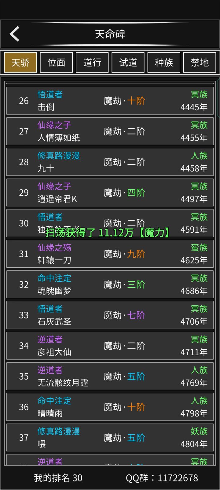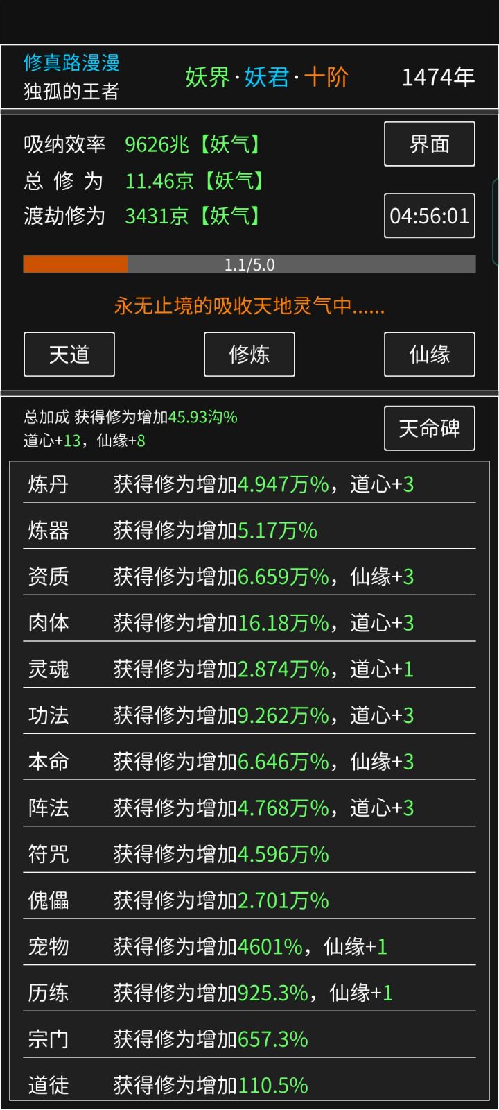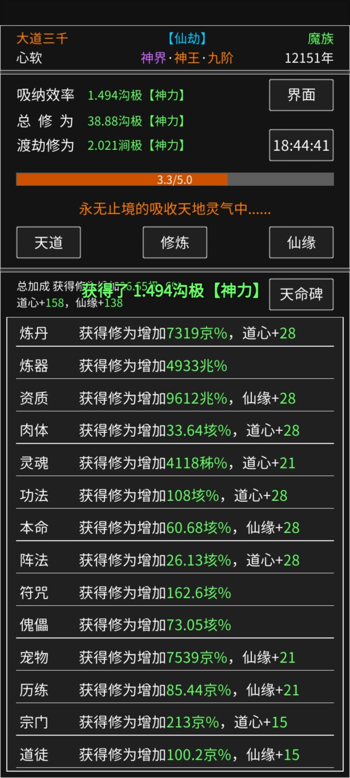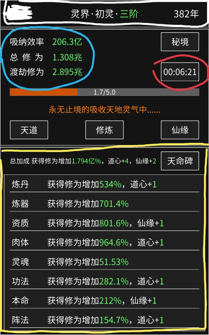 一、主界面1.修炼与渡劫板块(蓝圈)吸纳效率指的是你当前的修炼速度,可以在修炼板块中消耗修为来提升效率(具体提升情况看黄圈),每过5秒钟就会将等同于修炼效率的修为计入总修为中,当总修为到达一定数量超过渡劫所需的时候就可以通过渡劫来提升一级小境界(1兆=10,000亿),同时修炼速度会有所提升(上方白圈),当小境界到达十阶时再渡劫就会提升一级大境界(同时小境界被重置到一阶),十个大境界全部修炼圆