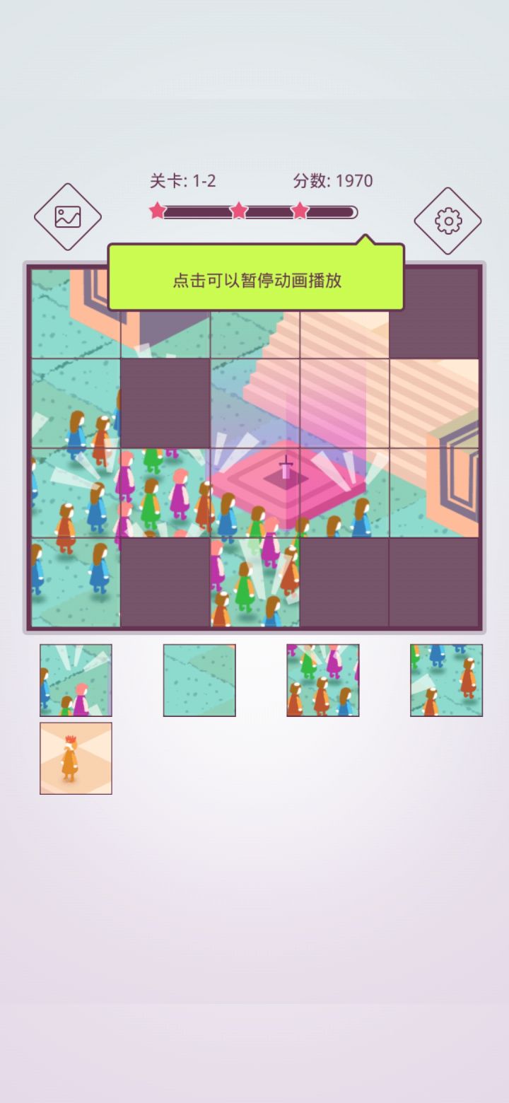 通关了。但是后面有大问题啊喂!1.字幕的错字就不说了。比如,取了公主。。。2.一开始那个暂停画面那个看得我一脸懵,点哪都不知道,然后一直显示,还以为我卡了。并不知道怎么操作。3.拼图中间没有暂停,如果点了右上角那个设置就只能回主界面或者重新开始,这个就有点搞心态!4.后面关卡难度增加了,原有的拼图不是固定在正确位置。如图,最后一关的时候,有时候已经拼起来了,但是移动的时候又散开了怎么回事?