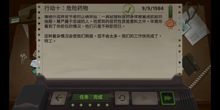行动八:飞行风险补充在开头:凸耳扳手可以把尸体从轮胎和箱子里卸出来,叉车可以把箱子从飞机上卸下来。1. 拿上尸体上的刀,进入飞机场,拿烤肉架便边的扒铲,同时从烤肉架中铲一块冒烟煤。2. 到后院,拿扒铲撑起卷帘门进入仓库。拿刀划破白色包裹得到危险药物。拾取地上的塑料包装和凸耳扳手。3. 离开仓库,撤走扒铲,向车中丢一块冒烟煤。4. 回到尸体处,捡起尸体,用凸耳扳手卸下拖拉机轮胎。在背包中组