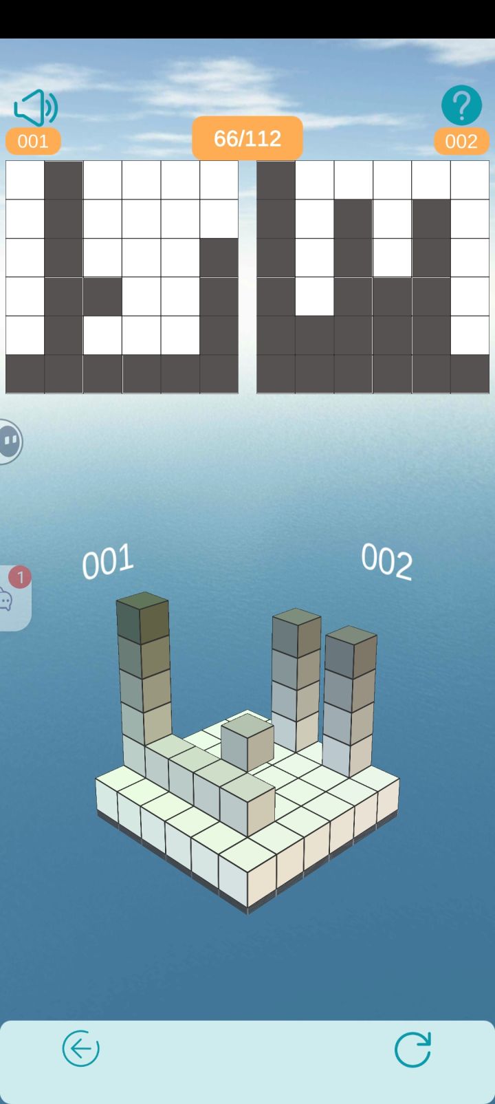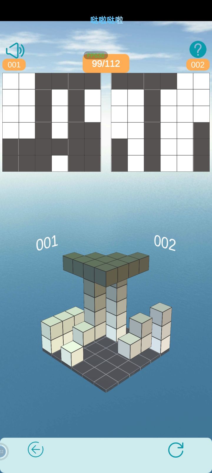没有思考全是技巧 分层分析 先看001第一行哪几个格子有阴影,然后在立体图里点亮 然后看002第一行,哪几个格子有阴影,在立体图里点亮 然后点亮高1,添加,第一层就好了 然后每一层以此类推 建议卡关的时候用 因为用了这个技巧之后就没什么思考的乐趣了,慎用