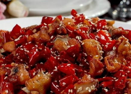 辣子鸡块是四川汉族风味名菜,属于川菜。用鸡脯肉加辣椒炒制而成。泡红辣椒是四川特产,为川菜的特有的调味料,色鲜亮、入口香嫩,同时花生香脆,新鲜微咸。
