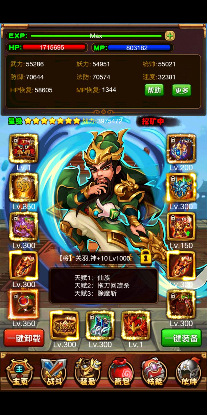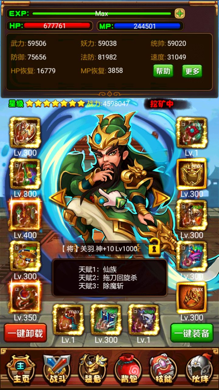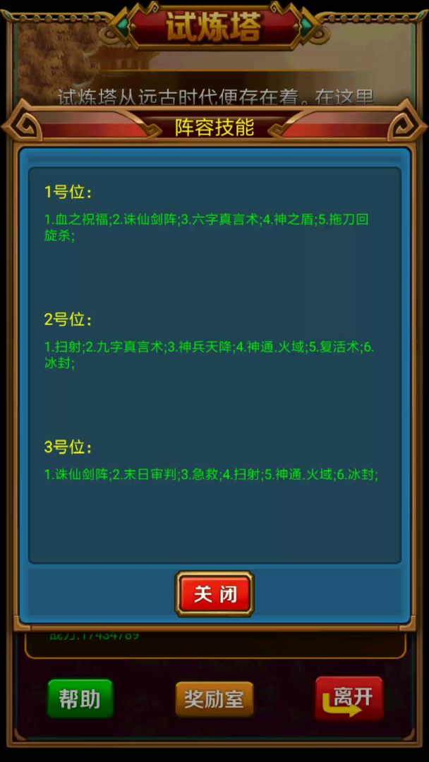 随着版本的更新七星诸葛的弊端越来越明显。这次给大家带来的是七星神关羽过木之试炼的攻略,主要的思路就是依靠神关羽的神技除魔斩破除试炼怪1500的复活。然后另外两个只需要靠着免伤活到最后一直给关羽加buff和复活就行。下面是我人物的技能以及属性面板,ps:问了一下大佬所以要更正一下,这里的神关羽的除魔斩应该放在三号位(先除魔然后靠剑阵打出破魔效果)。相比较来说这个阵容基本不吃装备,而且不选