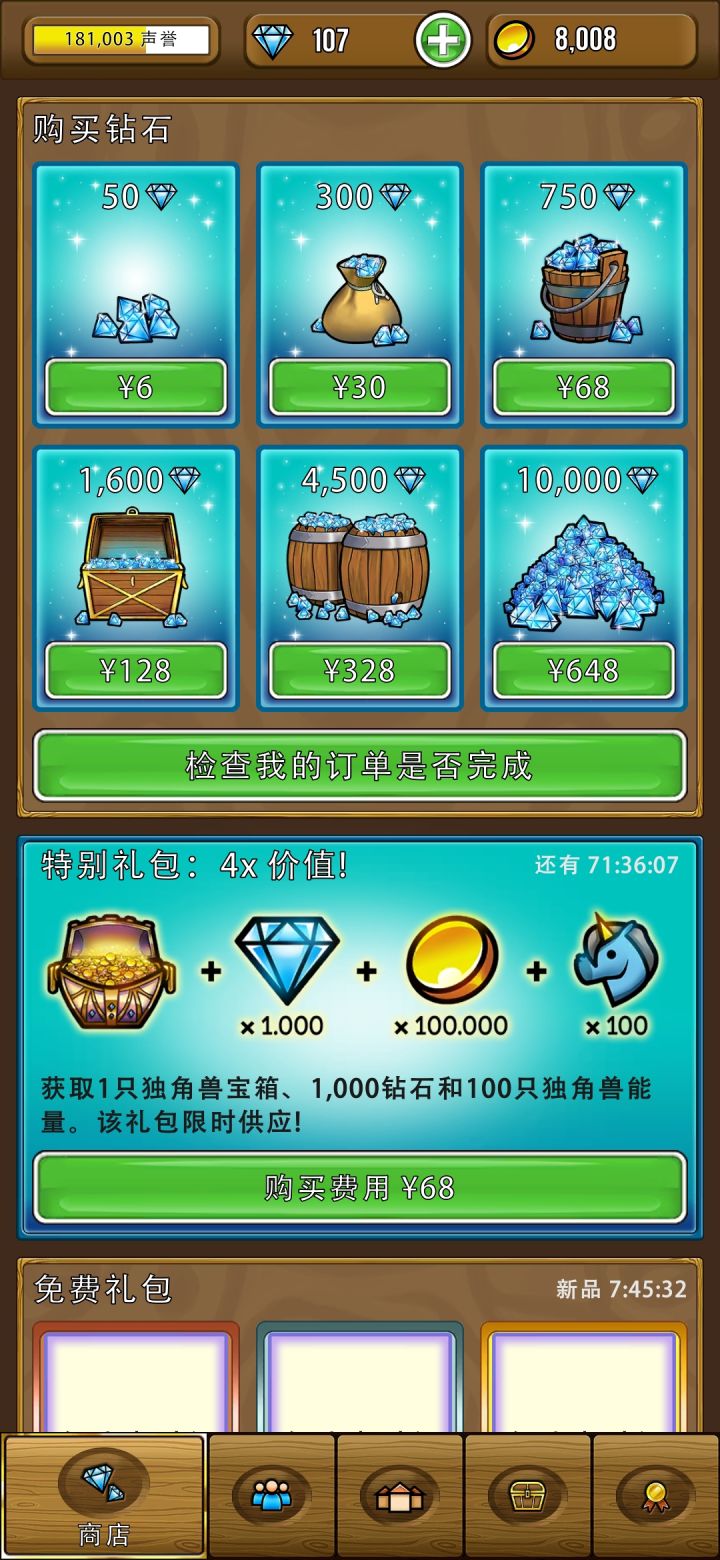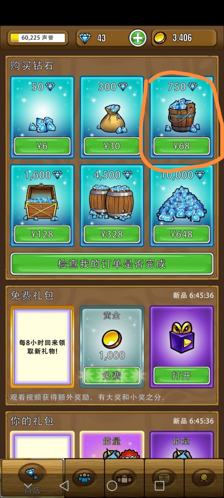 花了68买钻石,钱过去了钻石却没有到账,点击那个检查我的订单是否完成也没有反应,麻烦查一下怎么回事,要么把750钻石补上,要么就给我退款