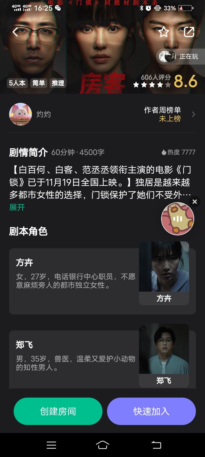 挺长时间没玩到那么吸引我的剧本杀了,这个剧本杀和电影《门锁》相同,写了独居女性的故事,每个角色都非常生动,剧情写的也身临其境。借一下电影宣传语:“独居是她的选择,不是伤害她的理由”
