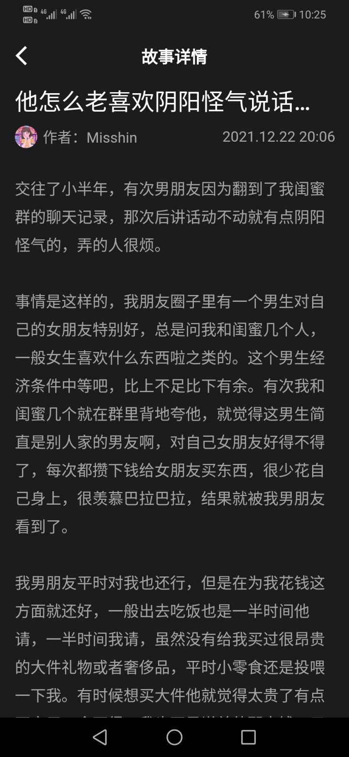 这个故事,🤣楼主跟朋友玩的时候都是出奇的意见一致。这个故事的内容总结出来就是:男朋友看了我跟闺蜜的聊天记录,发现我们都对其中一个闺蜜的男朋友的做法表示认可和羡慕以后,男朋友自卑从而开始阴阳怪气的故事。其实作者在写的时候应该也觉得,要分。因为这样子的沟通,两个人都是很累的。只要自己心态放正就行。女生也没有一直说拿来比较,所以男生也不需要说以此借题发挥。总之,分之前双方就这件事情再谈一次,如果男