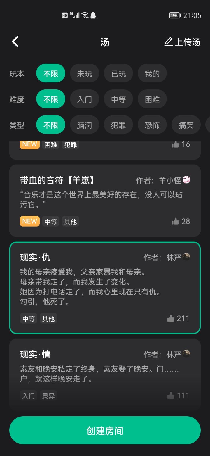 在剧本杀中分为很多不同的剧本,如:爱情本、恐怖本、鬼怪本、推理本等数不胜数,这里强烈推荐一个恐怖本“迷失”【图片三】,在一个微信群中,被无辜邀请进来的11个人,里面有多少是人有多少是鬼,谁是群主,群主到底是人是鬼,在背后操纵的人又是谁?一个个扑朔迷离的案件,令人汗流浃背,在生日桌宴上,热闹的环节结束后,迎接的就是这场剧本杀。