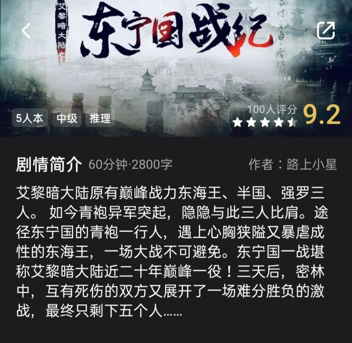 【剧本介绍】剧本名称:《艾黎暗大陆之东宁国战纪》剧本人数:5人剧本难度:中级剧本类型:推理【故事简介】艾黎暗大陆原有巅峰战力东海王、半国、强罗三人。如今青袍异军突起,隐隐与此三人比肩。途径东宁国的青袍一行人,遇上心胸狭隘又暴虐成性的东海王,一场大战不可避免。东宁国一战堪称艾黎暗大陆近二十年巅峰一役!三天后,密林中,互有死伤的双方又展开了一场难分胜负的激战,最终只剩下五个人……【人物