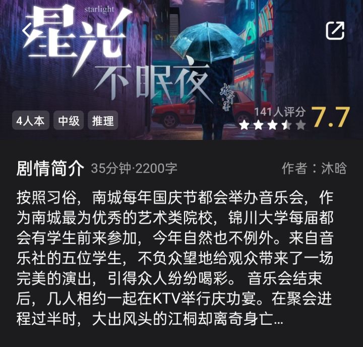 个人评分:四颗星实际游玩时长:60min人数:4人星光不眠夜真的是超——适合新手的推理本!整体剧情通顺,就算刚接触剧本杀也不用担心看起来很费劲的问题。整个本子玩下来属于中规中矩的推理本,故事情节和推理部分都在线,也都不至于太复杂!每个角色的故事情节分配的比较平均,之间的情感纠葛也很有趣hhh,适合叫上好朋友一起玩!线索推理性也很强,难度适中,整体剧情不会太恐怖,没有血腥情节,胆小的小伙伴