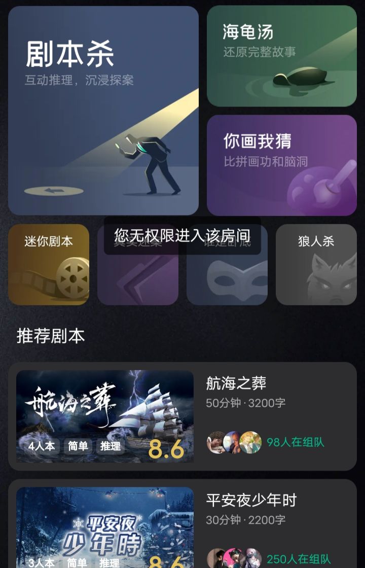 我吐了,谁是凶手app的你画我猜为什么显示您无权限进入该房间呀?你画我猜是我最喜欢的游戏之一,能和沙雕网友们沙雕的画,沙雕的猜。然后现在好多房间都进不去了,客服说因产品调整 目前APP内仅可进入本APP内的官方合作厅,其他软件的房间无法进入。希望官方大大们能够解决一下。