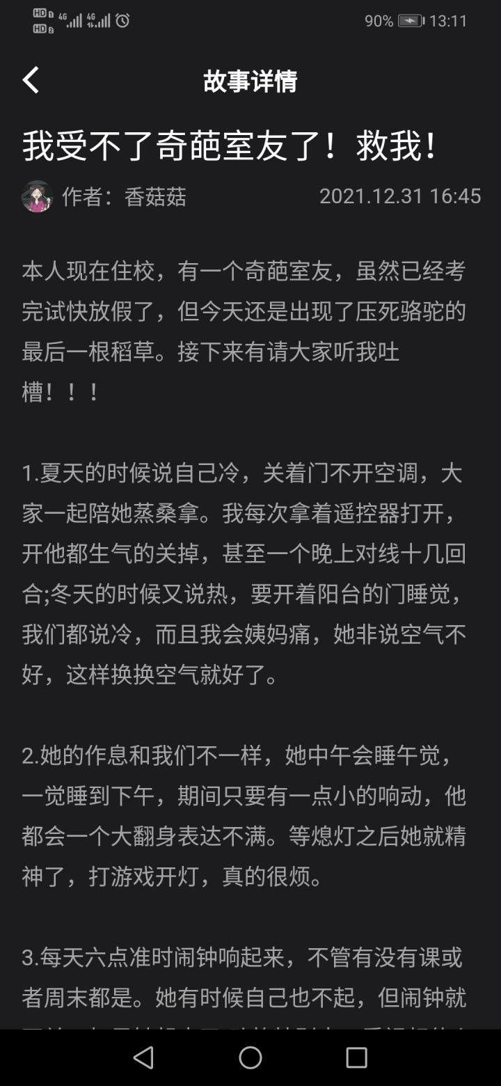 鉴定师-奇葩室友看完这个故事,只能说,你可以善良但也要有锋芒。自己都难受成这样,还在想当好人去让自己忍,你能做到那就不要吐槽。做不到,那就提出来,不能一步步的去忍让。忍让解决不了问题从故事里的角度,大概可以看到,但是这个女生自己不改是没有用的,集体意识没有,没法让所有人去迁就你。家庭背景不是放纵的理由,要自洁。