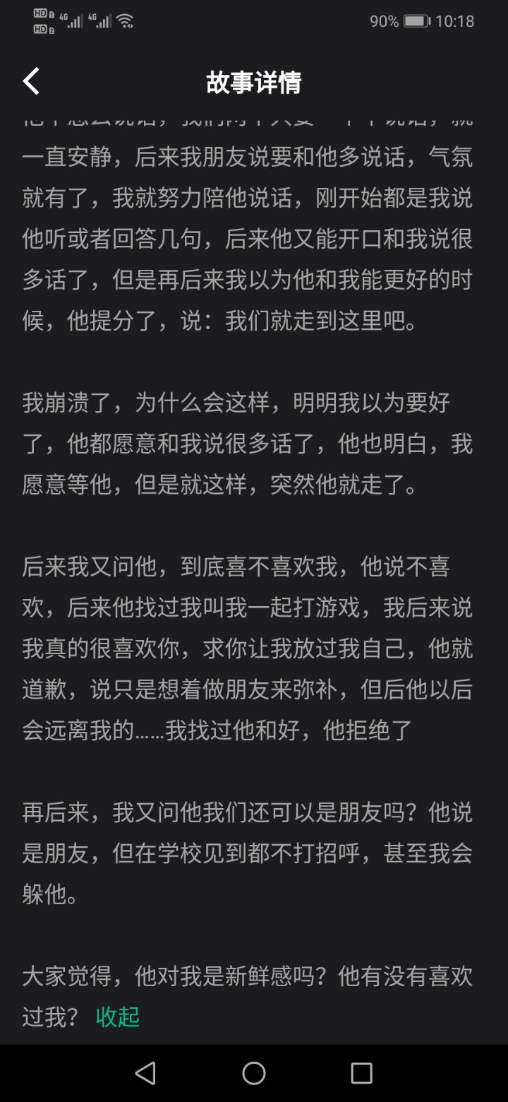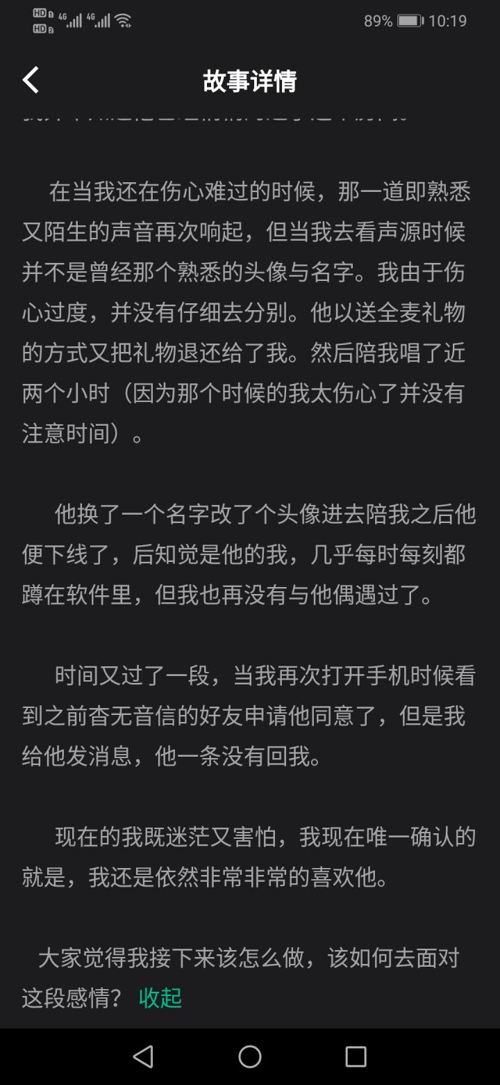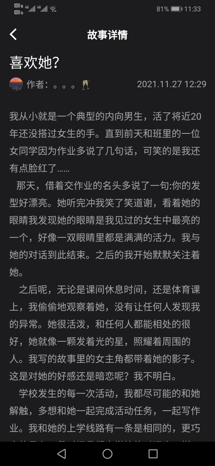 鉴定师-喜欢她这个故事当时楼主跟朋友们讨论的时候,起了相当大的争执。争执的地方就是投票环节,楼主选的是告白,朋友选的是不打扰,做朋友。因为通篇下来作者也说了自己是个自小内向的人,跟这个女生也是没有太多的接触,属于默默喜欢的类型。所以他们都不认为作者会选择表白。但我觉得会,因为喜欢就是这样没有理智。最后观点讨论,作者说的是告白hhh,楼主当时贼开心~肯定是因为作者有这个想法所以才提的这个。