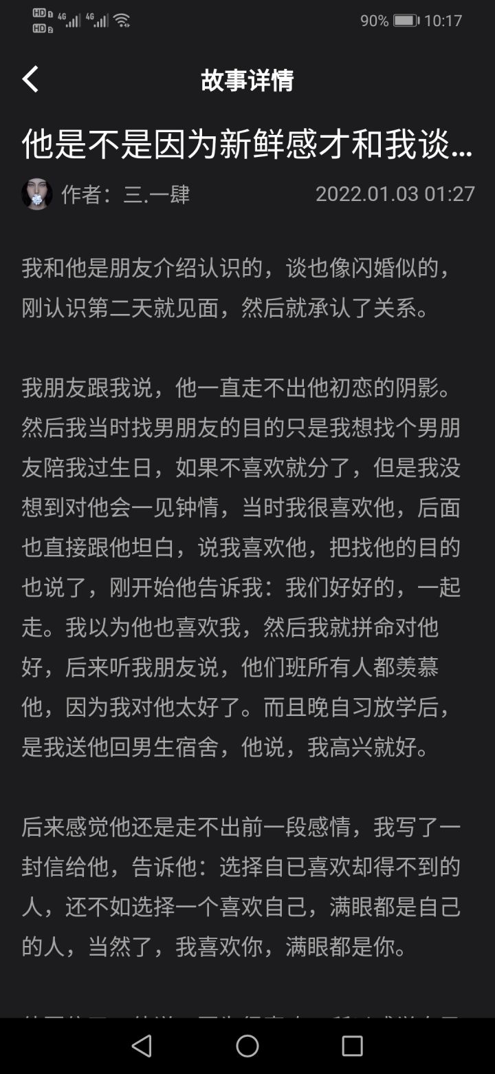 鉴定师-他是不是因为新鲜感才和我谈恋爱emmm,通篇看下来女生的喜欢确实浓烈又真实,但是男生的态度楼主认为已经不重要啦,因为你们现在已经不是情侣。再去纠结这段感情反而会让自己沉溺,既然分了,那就看开吧。如果忍不住,那就再勇敢一次,如果可以,那就不要重蹈覆辙啦。化悲愤为动力先去学习吧。