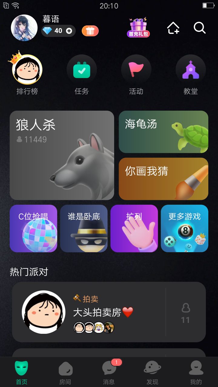 这个软件非常好玩,可以交友,可以拍卖可以唱歌可以狼人杀可以玩小游戏,可以加入联盟认识很多狠多有趣的人
