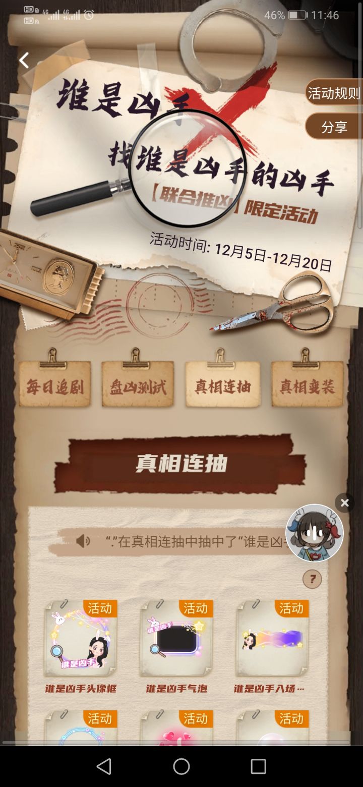 谁是凶手APP&网剧《谁是凶手》,特别定制【盘凶能力测试】,快来测测你的判案能力吧~1.分享【测试结果】至朋友圈集赞并截图,需公开可见,保留3小时以上,集赞并截图。2集赞8个即可获得【180】钻石奖励,集赞超过18个可获得【350】钻石奖励,集赞超过50个可获得【谁是凶手】精美周边1份3.以上3种奖励,1个用户只可获得1种还有下面的真相连抽~每天一次免费机会。千万别忘记了呀