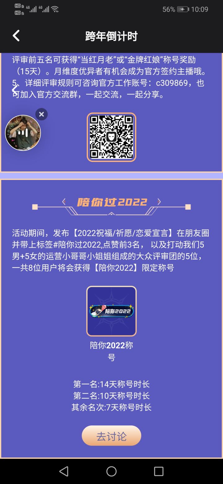 陪你2022活动最重要的是这次活动不限cp,可以是祝福,可以是祝愿,当然也可以是恋爱宣言活动期间,发布[2022祝福/祈愿/恋爱宣言] 在朋友圈并带上标签#陪你过2022,点赞前3名,以及打动系统5男+ 5女的运营小哥哥小姐姐组成的大众评审团的5位一共8位用户将会获得[陪你2022]限定称号!而且自从系统更新后,只要进房间,称号就会自动出现,超炫酷~就很羡慕