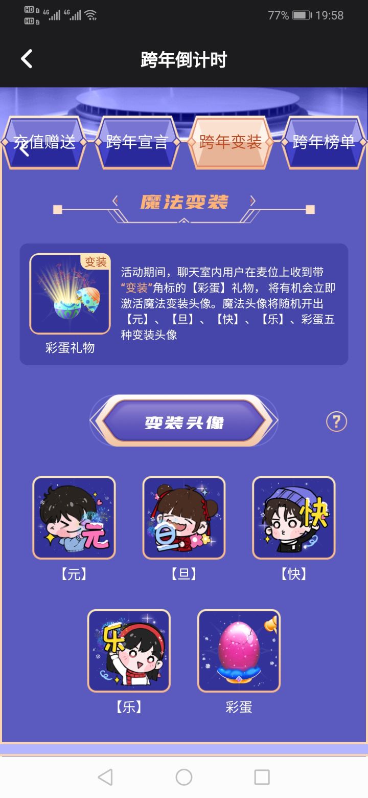 跨年变装活动来啦~今晚一定要拉上好友一起,集齐5种头像然后截图hhh,必得去炫耀~然后,又是个点亮新礼物图标的时候啦~活动期间,聊天室内用户在麦位上收到带"变装"角标的[彩蛋]礼物,将有机会立即激活魔法变装头像。魔法头像将随机开出[元]、[旦]、[快]、[乐]、彩蛋五种变装头像