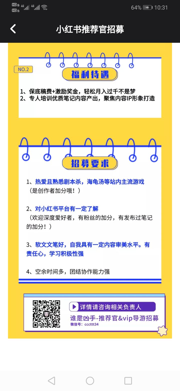 招募小红书推荐官啦!~福利待遇是酱紫的:1、保底稿费+激励奖金,轻松月入过千不是梦2、专人培训优质笔记内容产出,聚焦内容IP形象打造这是招募要求~:1.热爱且熟悉剧本杀,海龟汤等站内主流游戏(是创作者加分哦! )2.对小红书平台有-定了解(欢迎深度爱好者,有粉丝的加分,有发布过笔记的加分! )3.软文文笔好,自我具有一定内容审美水平。有责任心,学习积极性强4、空余时间多,团结协作能力强快扫描图片二维码开启你的小红书推荐官之旅吧~