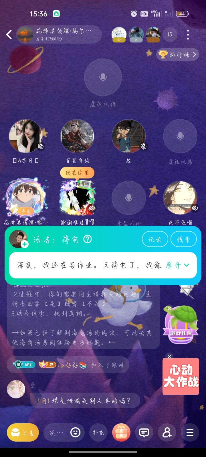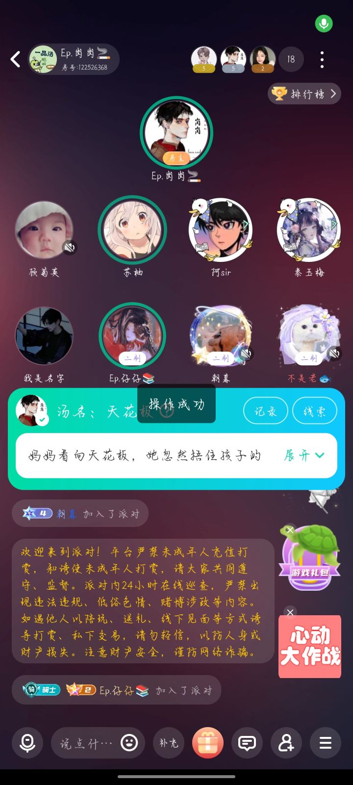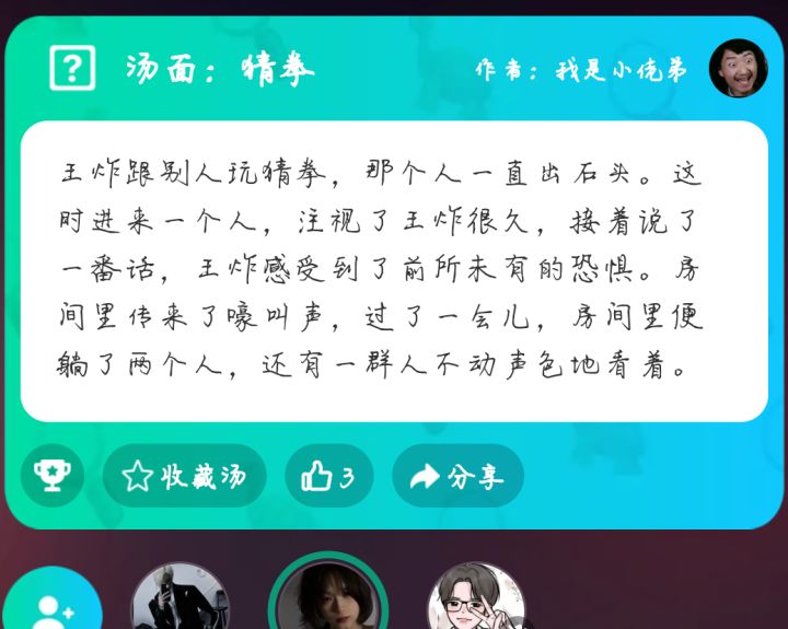 根据我个人的亲身体验发现这款游戏有许多特别的魅力,首先呢就是我今天所发的这个海龟汤了,一些朋友可能没有听过海龟汤这种游戏在这里我简单的给大家介绍一下海龟汤是一种情境推理游戏由出题者给出一个很难理解的现象参与者通过向出题者询问来缩小范围,出题者面对参与者的问题只能回答是与不是直到参与者最终猜出正解。而在我所推荐的APP中我们玩家通过匹配房间进入游戏每个房间的房主做出题人从APP的汤库里面选择情境开始游戏 。在游戏开始后玩家可以通过打字的方式进行提问当每次玩家的提问得到是或者是与不是的回答后玩家将会获得一点游戏积分。玩家也可以通过直接打开麦克风的方式参与提问但由于无法统计所以并不会获得积分所以我个人还是更喜欢打字进行提问。在游戏开始后右下角的地方有一个圆形的线索字样所有获得出题者是的答复的问题会被收录在线索之中方便中途进入游戏的玩家快速跟进节奏也有利于玩家们最后归纳故事整体的步骤。细心的朋友或许已经发现了,在我上传的第三张图片中第三个人头像下面有一个二刷字样,这个二刷表示该玩家已经玩过这个海龟汤并且看过汤底,APP为了提高玩家的体验防止个别玩家恶意破坏他人游戏体验专门将玩家玩过的海龟汤标记出来每一个见到汤底的人都会被标记二刷字样不得不说还是非常用心的。最后呢就是这个APP设计又一亮点了玩家可以自行编写海龟汤上传(还可以署名哦)审核通过后就可以进入汤库供大家玩耍了,想一想邀请一些自己非常要好的朋友来盘自己写的汤想想就很有趣。所以说呢这个APP真的很不错值得下载