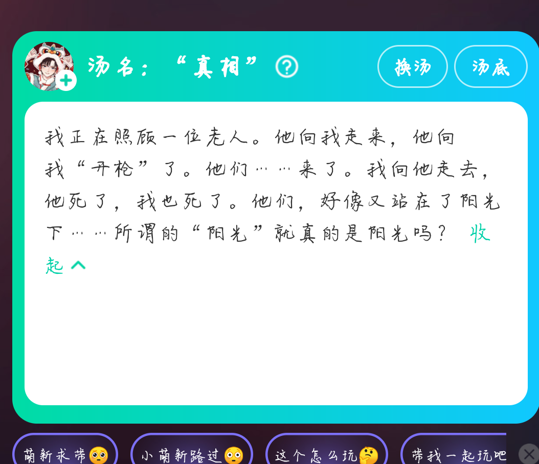 海龟汤是一个情景还原类的游戏,需要玩家们问房主问题,然后房主会回答玩家们“是”“不是”“不重要”,然后通过玩家们的线索拼凑故事的真相,大家一起来还原吧!