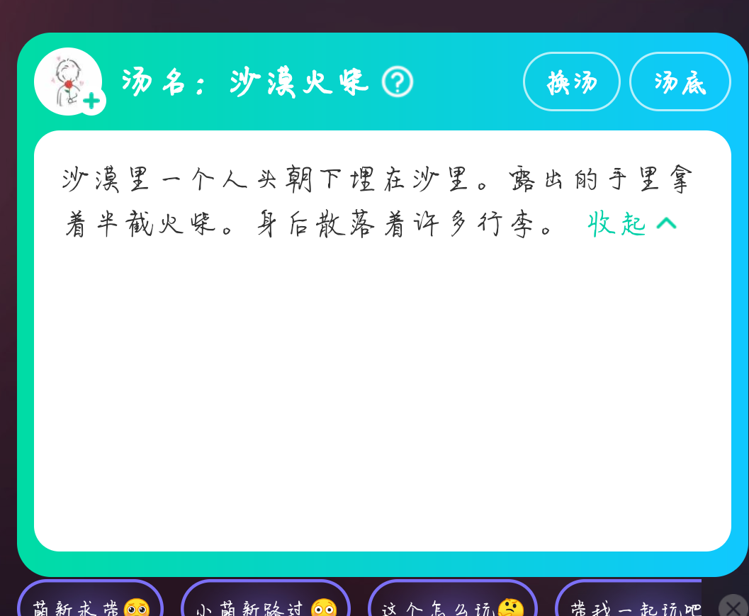 海龟汤是一个情景还原类游戏,一名主持多名玩家对话游戏,玩家根据汤面提出问题,主持根据汤底回'是’'不是’'是也不是,然后玩家要根据得到的线索,推理出整件事情的经过,接下来让我们看一下今天的汤面