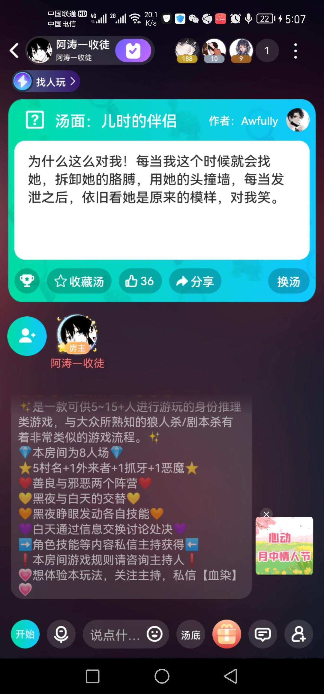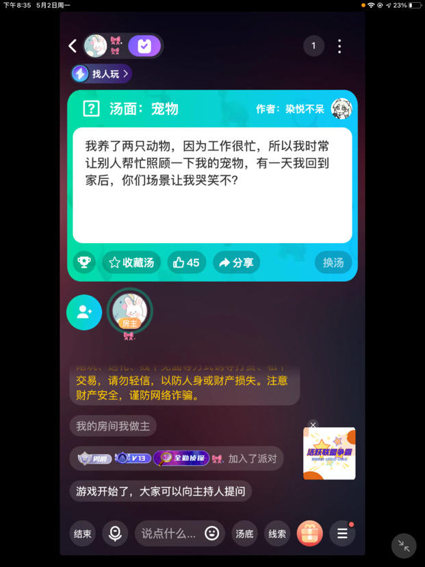 🥀现在来说一下游戏的玩法。海龟汤呢是一个情景还原类的游戏,你们可以向房主提出线索或者自己的疑问。房主通过海龟汤的汤底来回答是或者不是或者不重要。