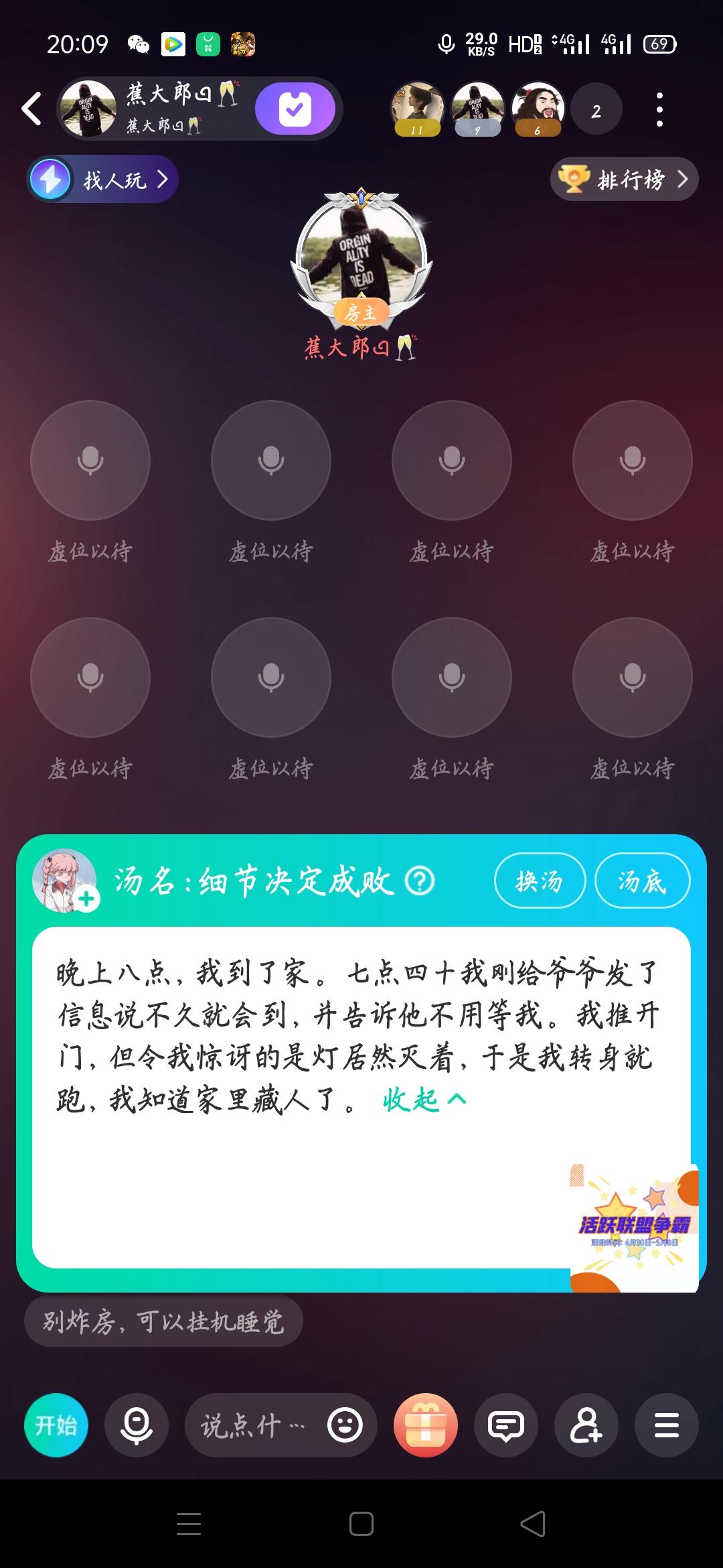 每日分享的海龟汤来啦,快和我一起探索事件的直相吧,友情提示,这次的汤底和犯罪有关哦。海龟汤是一个情景还原类游戏,一名主持多名玩家对话游戏,玩家根据汤面提出问题,主持根据汤底回'是’'不是’'是也不是,然后玩家要根据得到的线索,推理出整件事情的经过,接下来让我们看一下今天的汤面汤名:细节决定成败晚上八点,我到了家。七点四十我刚给爷爷发了信息说不久就会到,并告诉他不用等我。我推开门,但令我惊讶的是灯居然灭着,于是我转身就跑,我知道家里藏人了。玩家:藏起来的是爷爷吗?主持:不是。玩家:爷爷死了?主持:是。玩家:爷爷被他杀?主持:是。……想知道爷爷怎么死的吗?想知道我是怎么发现屋里藏着人吗?快来下载谁是凶手和我一起玩海龟汤吧!