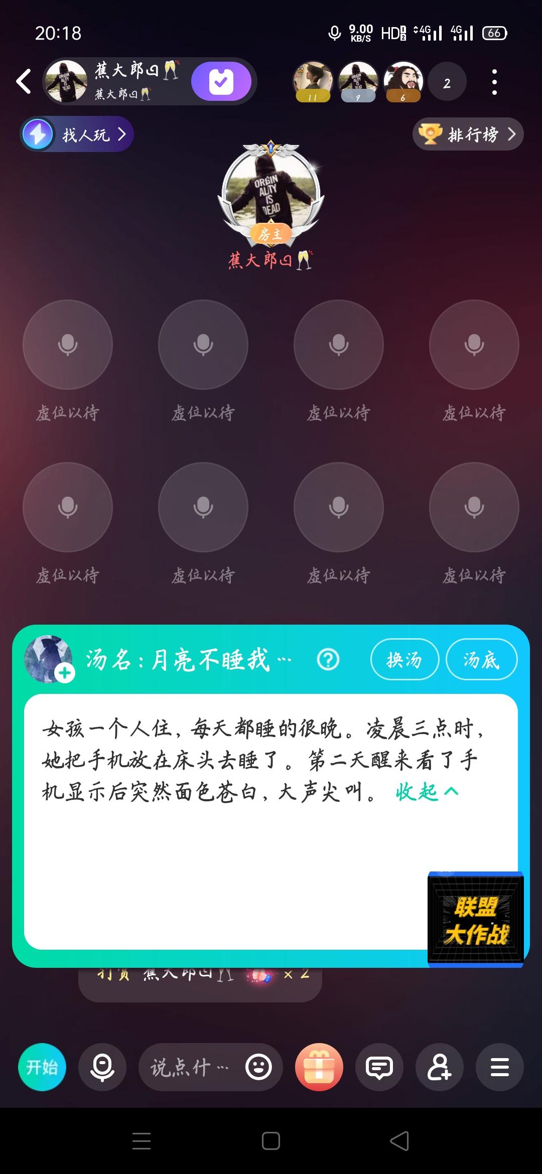 今天分享一个精品小汤。 汤面:突然有一天 十八新娘八十郎,苍苍白发对红妆。 但结 婚后她对现在的生活十分满意,突然有一天,她正在房间里收拾自己的物品,一群人冲进她的房间,她知道她自己马上要死了。 海龟汤是一个情景还原类的游戏,需要玩家们问房主问题,然后房主会回答玩家们“是”“不是”“不重要”,然后通过玩家们的线索拼凑故事的真相,大家一起来还原吧! 游戏开始 问:新娘是自杀? 答:不是 问:新郎背叛了新娘? 答:是 问:新娘是给新郎陪葬? 答:是也不是 …… 新娘跟新郎的关系?为什么突然有一天我死了?一群人是指的谁?把这几点理清,事情的真相就会慢慢揭开 。 快来下载谁是凶手,大家一起根据收集的线索,来还原事情的真相。