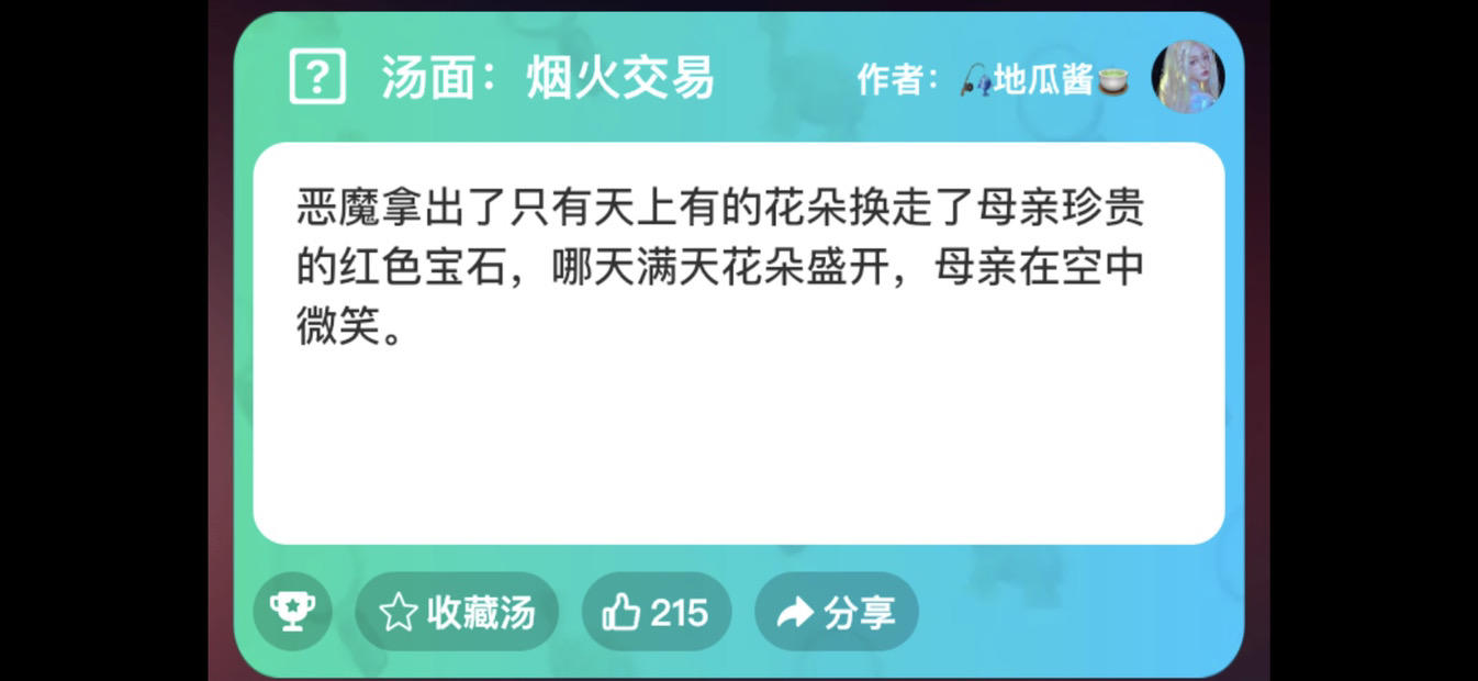 今天安利一个新的海龟汤,汤面:烟火交易恶魔拿出了只有天上有的花朵换走了母亲珍贵的红色宝石,哪天满天花朵盛开,母亲在空中微笑。海龟汤是一个情景还原类游戏,很像打灯谜,需要根据汤面也就是谜面,猜出汤底也就是谜底,过程中向房主提问问题,房主会回答你[是][不是][是也不是][不重要],然后根据“是”的线索找到真相。游戏开始......[问]: 放烟花?[答]:是[问]:花朵是烟花吗?[答]