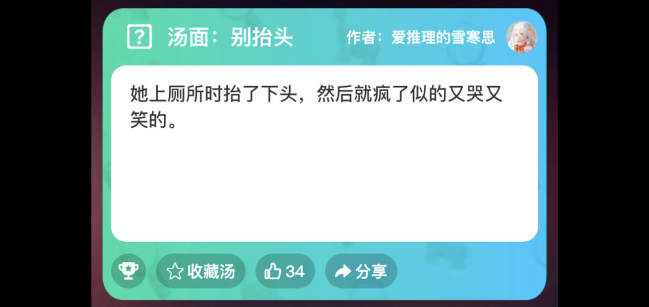 今天安利一个新的海龟汤,汤面:别抬头他上厕所时抬了下头,然后就疯了死的又哭又笑的。海龟汤是一个情景还原类游戏,很像打灯谜,需要根据汤面也就是谜面,猜出汤底也就是谜底,过程中向房主提问问题,房主会回答你[是][不是][是也不是][不重要],然后根据“是”的线索找到真相。游戏开始......[问]: 有人死了吗?[答]:是[问]:在公厕?[答]:是[问]:是看到尸体了吗?[答]:不是
