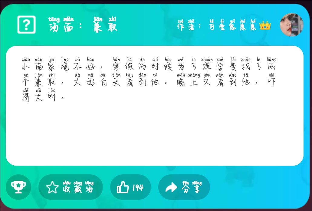 日常推荐今天我们玩了一个比较搞笑的精品汤。汤面:兼职内容:小南家境不好,寒假的时候为了转学费找了两个兼职,大妈白天看到他,晚上又看到他,吓的大叫。海龟汤是一个情景还原推理类的游戏,它很像打灯谜,根据我们的汤面也就是谜面,来猜出汤底也就是谜底。玩法就是你们通过汤面来向房主提问问题,然后房主会回答『是』『不是』『是也不是』『不重要』,你们则根据房主给出是的线索来推理出真相哦!那么问题来了喽!小南的两份兼职分别是什么呢?为什么大妈白r天见小南就没事呢?怎么到了晚上见小南就吓的大叫呢?小南的两份兼职有什么冲突吗?……只要把这些问题推理明白就能把真相解进来的,想知道答案吗?那就快来下载谁是凶手APP和我一起玩耍吧!