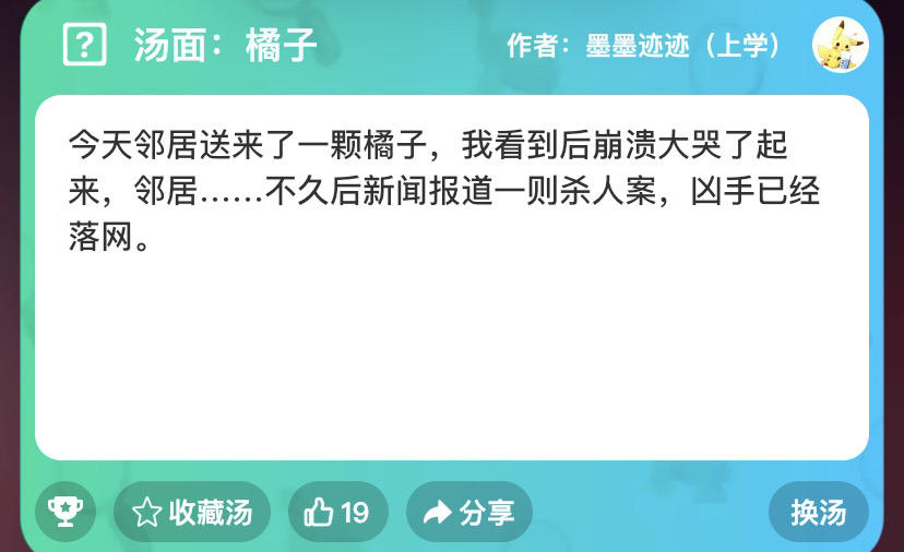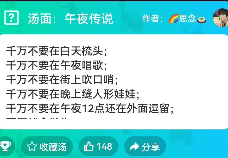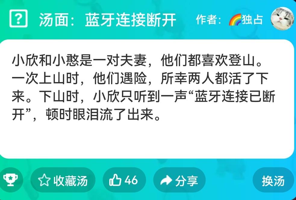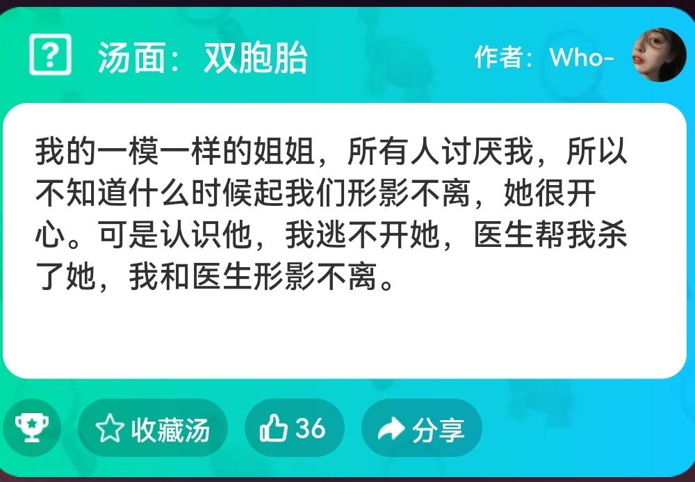 💕解决了这些问题,我们就能很快得出汤底啦~还有没有不会玩的小伙伴呀,简单说下海龟汤规则吧,就是你进去一个海龟汤的房间,然后根据汤面向房主提问,你会得到“是”或者“不是”的回答,根据“是”的线索推理出故事的真相就好啦~