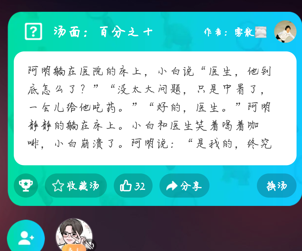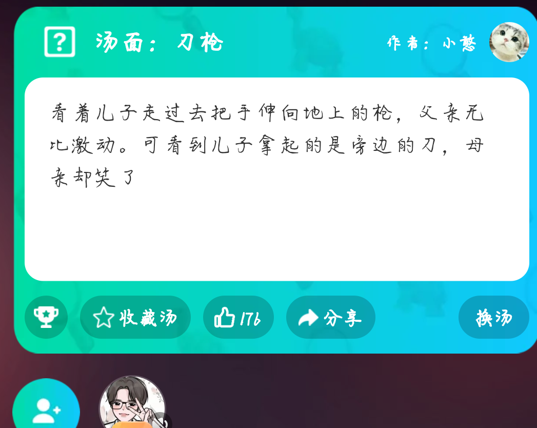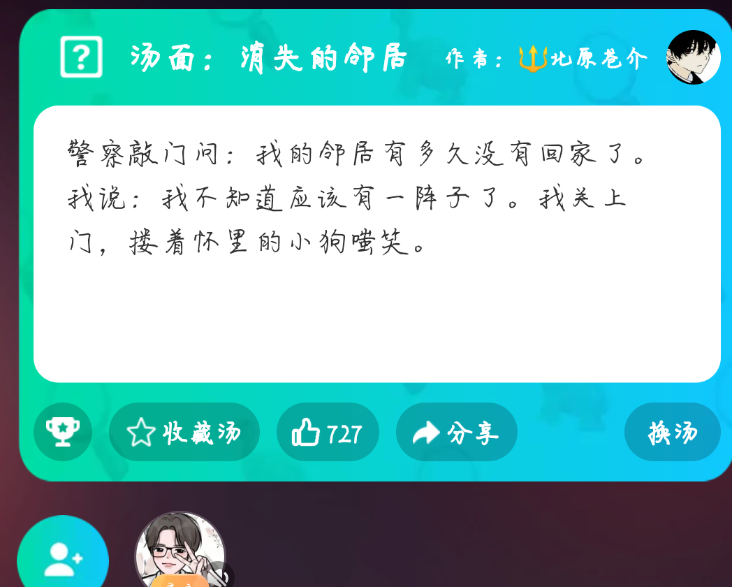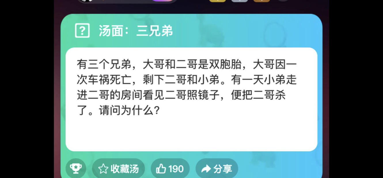 🍥出题者会给出一个不完整的故事,也称为“汤面”,让玩的人通过提问的方式,来验证出题者对故事缺失部分的猜测。但是!注意了!出题者只能用【是】【不是】或【不重要】来回答,直到猜出为止~