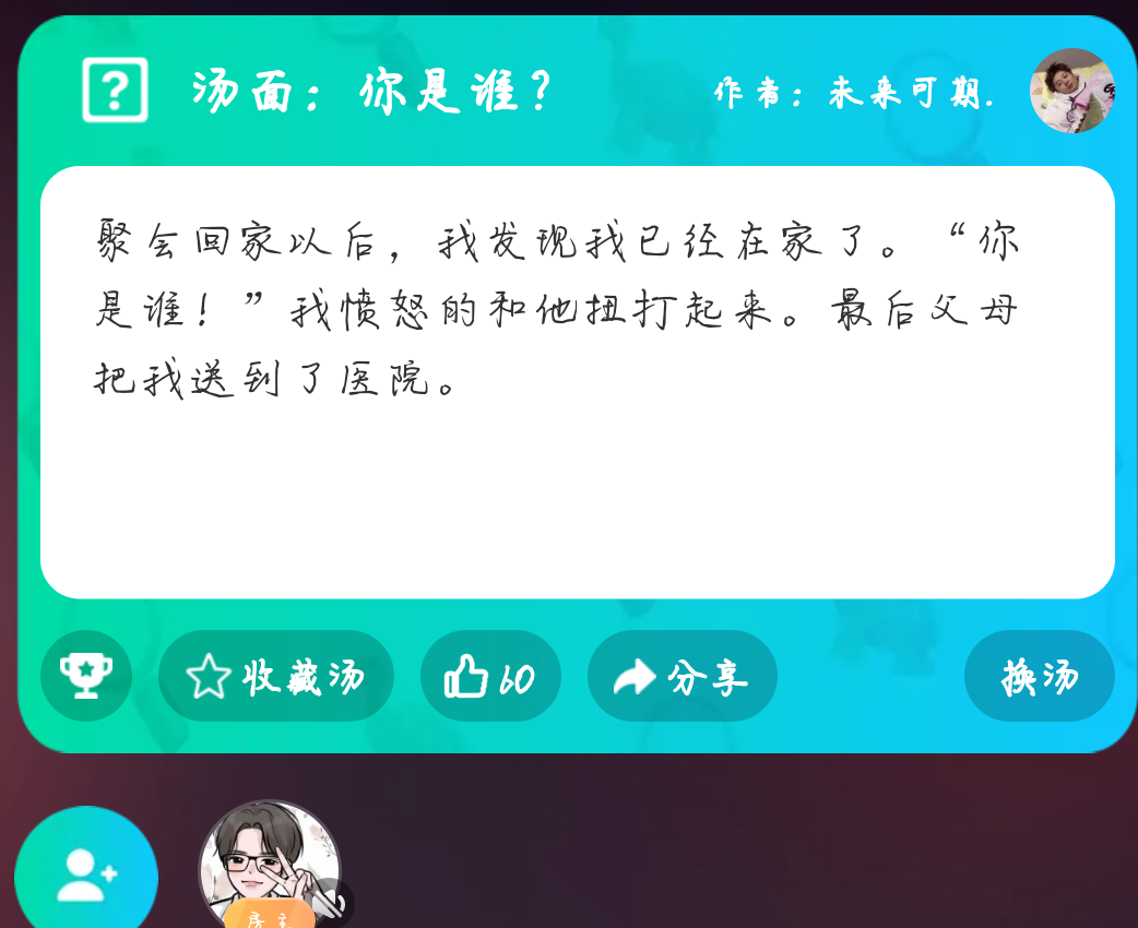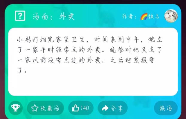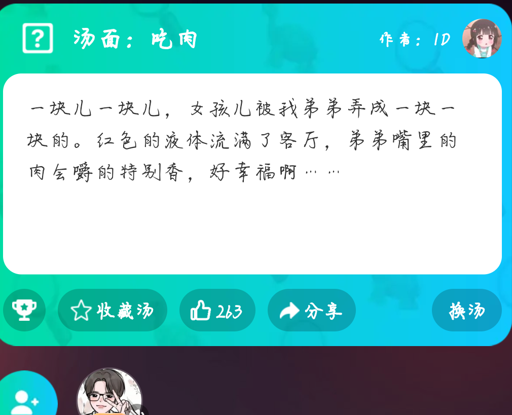 ✨房主通过海龟汤的汤底来回答是或者不是或者不重要。就举个例子弟弟杀人了吗?你们可以通过海龟汤的汤面来找到解答。当然还有其他隐藏的线索,你们可以用你们睿智的大脑来找到答案。🎈你们可以来下载谁是凶手,我们可以在上面一起来解谜。当然谁是凶手上还有可多好玩的小游戏。今日的每日好几汤就先这样 明天再见👋🏻