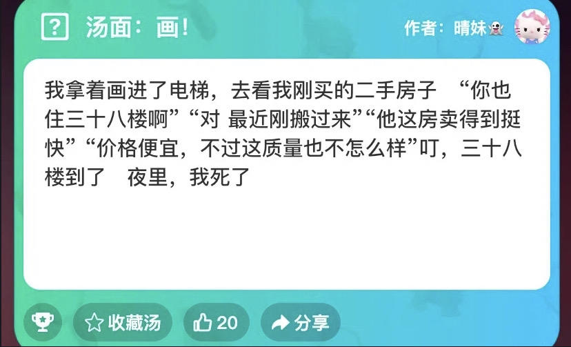 哈哈 又是海鱼汤喔 今天带来的是一个 恐怖 困难的本 不知道大家能不能猜出来呢~网话不多说 我们来看一下这个汤面“我拿着面进了电梯 去看我刚买的二手房子“你也住三十八楼啊”“对最近刚搬过来”“他这房子买得倒是挺快”“价格便宜 不过这质量也不怎么样”叮三十八楼到了 夜里 我死了”好啦 这就是我们今天的汤面啦对了 介绍一下海龟汤的玩法喔 根据汤面 玩家可以以是或不是的形式像主持人提问