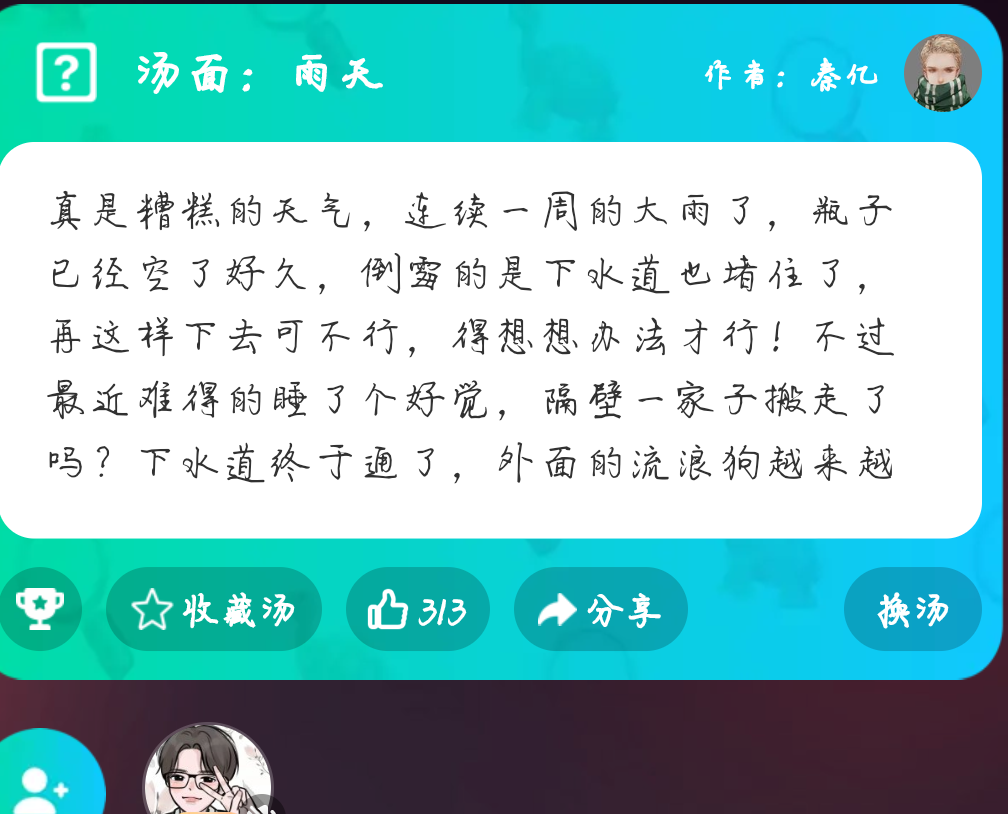 💐哈喽,大家好,欢迎来到每日几汤。接下来给大家带来一个关于恐怖的汤品。🥀汤面:雨天 真是糟糕的天气,连续一周的大雨了,瓶子已经空了好久,倒窗的是下水道也堵住了,再这样下去可不行,得想想办法才行!不过最近难得的睡了个好觉,隔壁一家子搬走了吗?下水道终于通了,外面的流浪狗越来越多,不知道还够不够。🍀现在来说一下游戏的玩法。海龟汤呢是一个情景还原类的游戏,你们可以向房主提出线索或者自己的疑问。房主通过海龟汤的汤底来回答是或者不是或者不重要。🍂就举个例子她是不是有病?你们可以通过海龟汤的汤面来找到解答。当然还有其他隐藏的线索,你们可以用你们睿智的大脑来找到答案。✨你们可以来下载谁是凶手,我们可以在上面一起来解谜。当然谁是凶手上还有可多好玩的小游戏。今日的每日好几汤就先这样 明天再见👋🏻