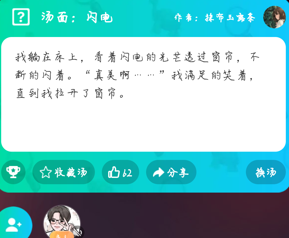 🎉哈喽,大家好,欢迎来到每日好几汤,今天给大家带了一个关于偷窥的海龟汤。💘汤面:闪电 我躺在床上,看着闪电的光芒透过窗帘,不断的闪着。“真美啊……”我满足的笑着,直到我拉开了窗帘。🌹现在来说一下游戏的玩法。海龟汤呢是一个情景还原类的游戏,你们可以向房主提出线索或者自己的疑问。房主通过海龟汤的汤底来回答是或者不是或者不重要。🥀就举个例子窗帘后面有什么吗?你们可以通过海龟汤的汤面来找到解答。当然还有其他隐藏的线索,你们可以用你们睿智的大脑来找到答案。✨你们可以来下载谁是凶手,我们可以在上面一起来解谜。当然谁是凶手上还有可多好玩的小游戏。今日的每日好几汤就先这样 明天再见👋🏻