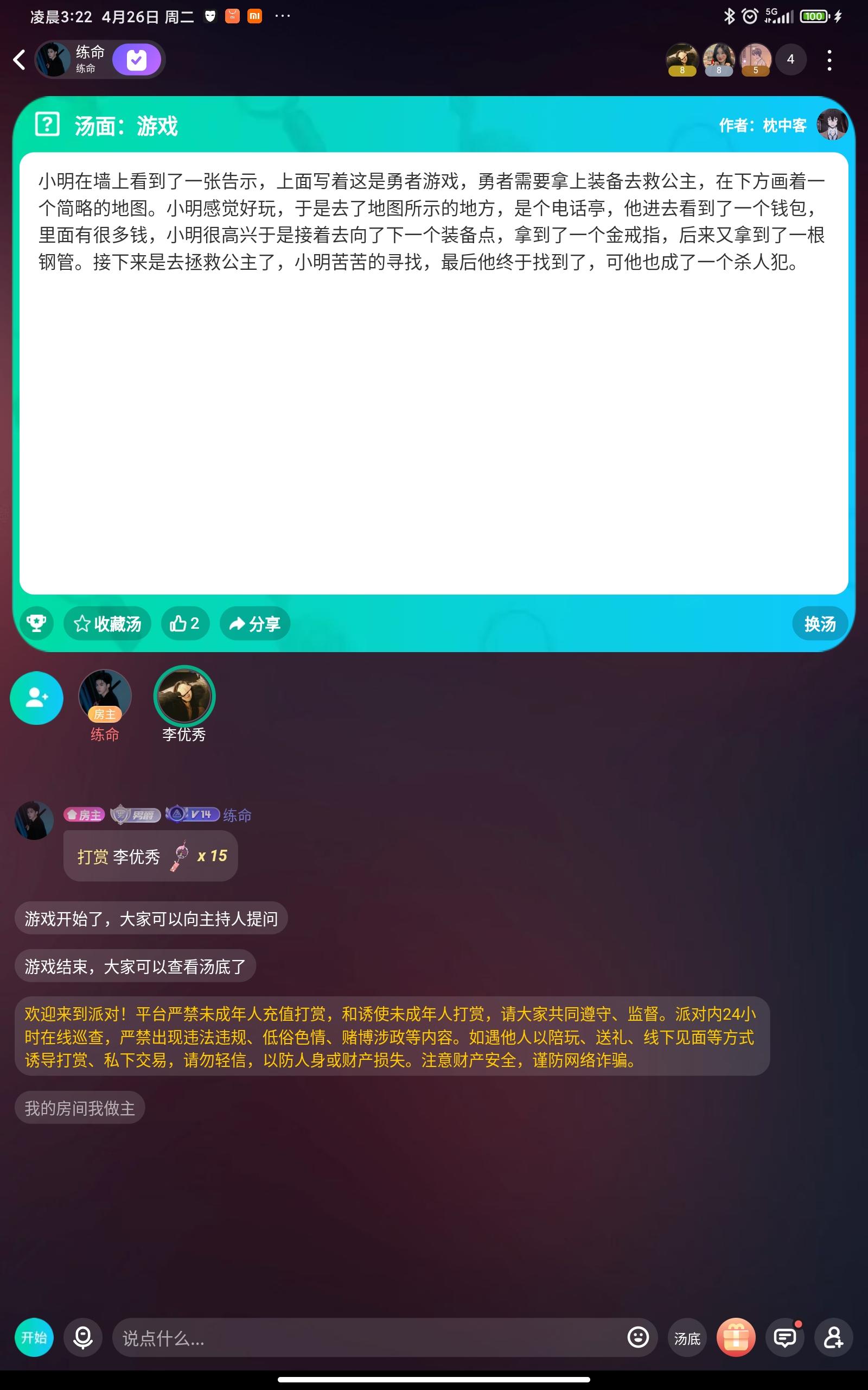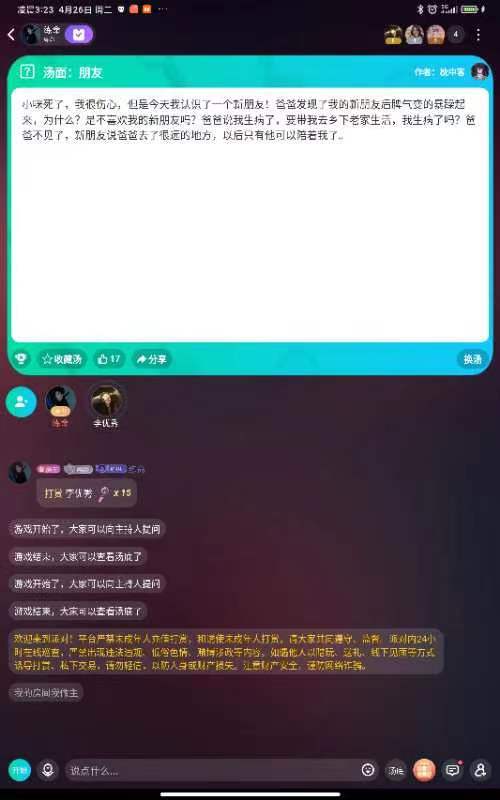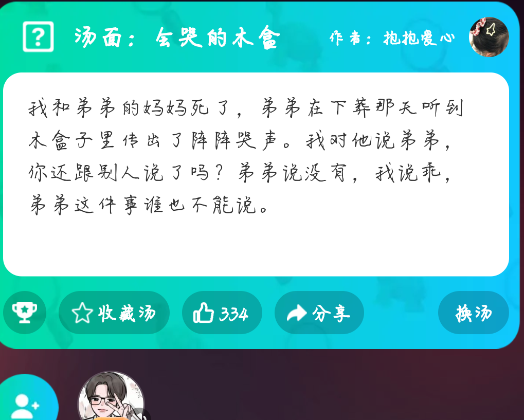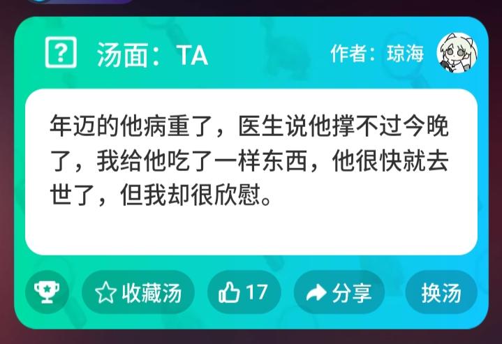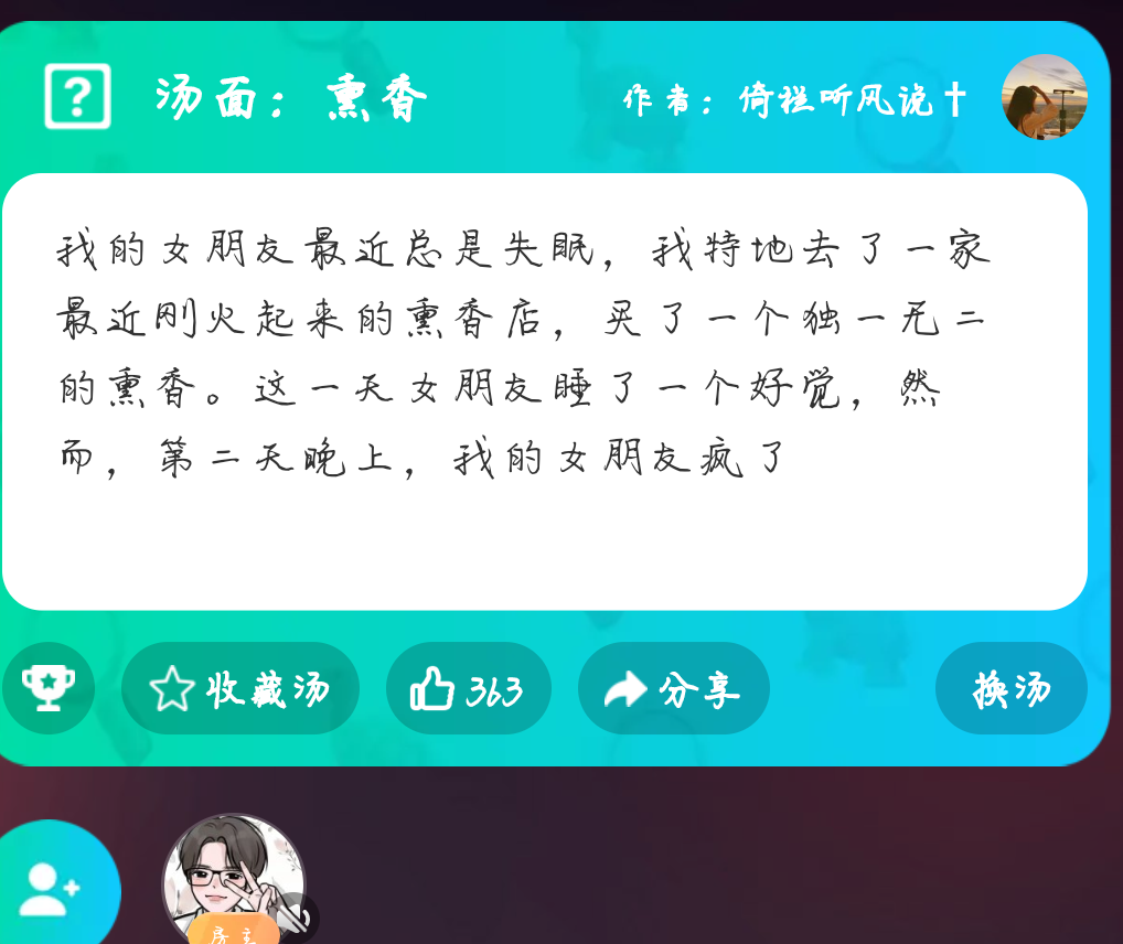 ✨现在来说一下游戏的玩法。海龟汤呢是一个情景还原类的游戏,你们可以向房主提出线索或者自己的疑问。房主通过海龟汤的汤底来回答是或者不是或者不重要。🥀就举个例子那个熏香有问题吗?你们可以通过海龟汤的汤面来找到解答。当然还有其他隐藏的线索,你们可以用你们睿智的大脑来找到答案。🍁你们可以来下载谁是凶手,我们可以在上面一起来解谜。当然谁是凶手上还有可多好玩的小游戏。今日的每日好几汤就先这样 明天再见👋🏻