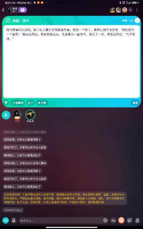 汤面:我与同事们玩游戏,输了的人要对老板做某件事,我第一个输了,裁判让我吓唬老板:"我知道你一个秘密!"我如实照做,老板听我说完,笑着拿出一盒饼干,我吃了一块,老板忽然说:"你不知道。”