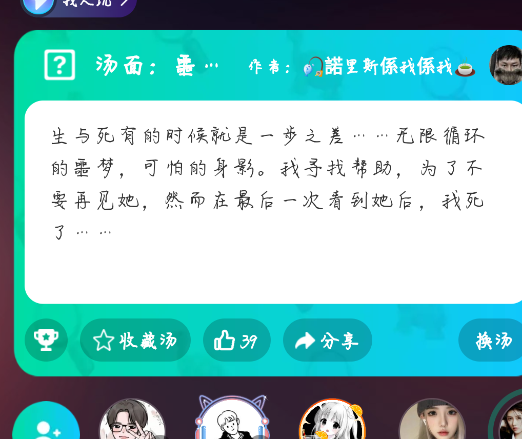 现在来说一下游戏的玩法。海龟汤呢是一个情景还原类的游戏,你们可以向房主提出线索或者自己的疑问。房主通过海龟汤的汤底来回答是或者不是或者不重要。就举个例子主人公经常做噩梦吗?,你们可以通过海龟汤的汤面来找到解答。当然还有其他隐藏的线索,你们可以用你们睿智的大脑来找到答案。你们可以来下载谁是凶手,我们可以在上面一起来解谜。当然谁是凶手上还有可多好玩的小游戏。今日的每日好几汤就先,这样 明天再见