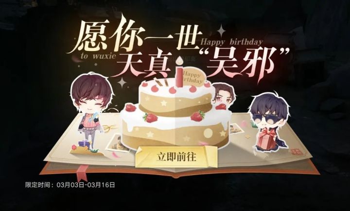 春风轻动,万物新生,桀骜少年敛痴狂,唯愿天真归无邪。吴邪老板的生日马上就要到了,盟盟我最近忙着给老板准备惊喜呢!登录好礼、生日祝福、欢乐派送,吴邪生日月大量福利来送!参与活动为吴邪献上生日祝福和礼物,大量材料等你来拿!吴邪·英伦绅士,神品纹章,高级伙伴技能书自选包等好礼待弟子们一网打尽。活动时间:3月3日-3月16日23:59活动入口:游戏主界面显示活动ICON参与范围:服务器时间大于7天