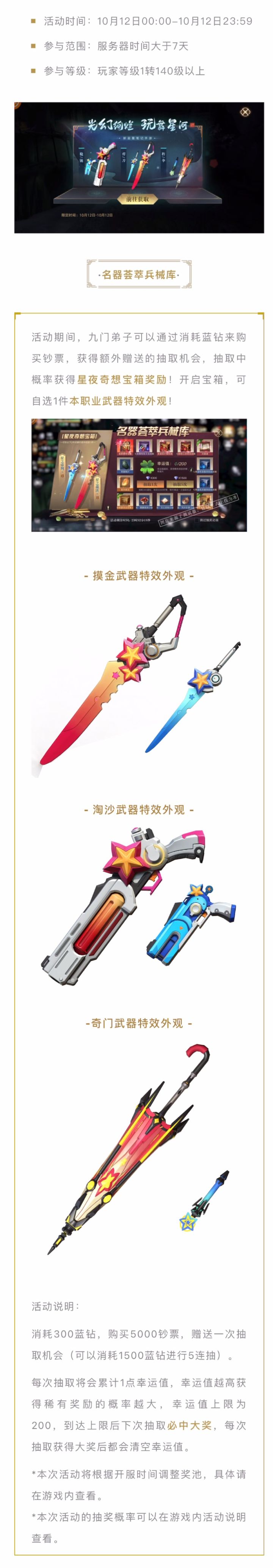 各位九门弟子,光幻绚烂,玩舞星河!名器荟萃兵械库活动即将开启!参与活动,即可获得全新超炫酷精美星夜奇想主题特效武器外观大奖!