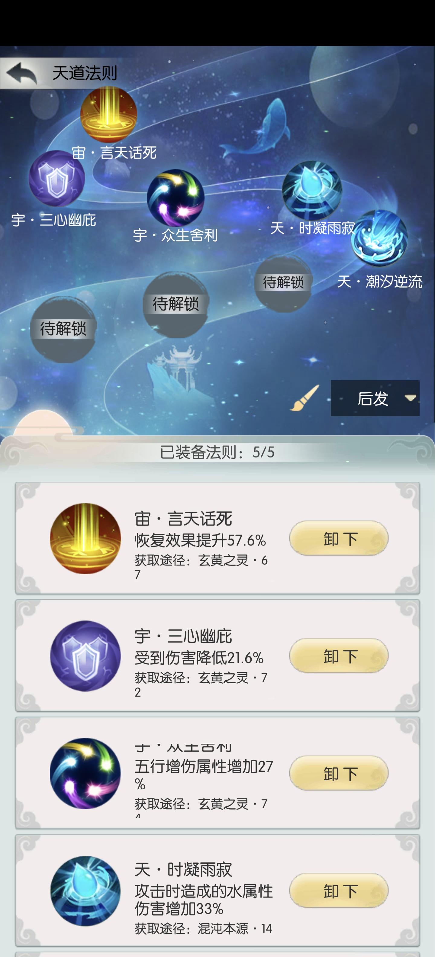 神级装备就可以点化了 , 所以写给刚刚接触点化玩法的萌新 —— 这个攻略是我和嘟嘟共同研究的 ,希望对萌新有所帮助 众所周知,点化的主要作用是为了增加主五的伤害数值,在这个前提下,最大化的利用点化和装备的属性和羁绊来提升角色的属性和战斗力。下面以我选择的木系主五为例,解释一下点化应该怎么选择。主五为木系,点化就要选择凑齐5件套来增加木系伤害,即无边落木(5/5):角色木系伤害提高10%,提