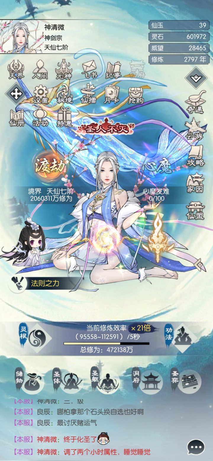 从2400年看到偷渡攻略开始准备化武圣,直到两千八百年才尝试成功真是太艰难了。非常感谢十方妖域大佬们的耐心指点,不然我自己恐怕都放弃了。仙途坑太多感觉自己都踩了遍要偷渡的大家一定要看好自己的血量,压不住血量实在太难了,好几次都想把五行天重置又舍不得用掉的法则。破虚21区神清微留念