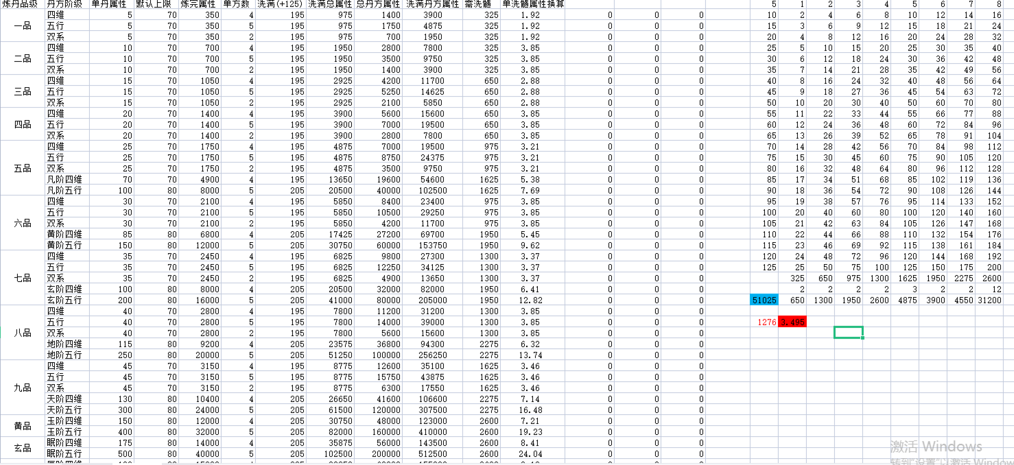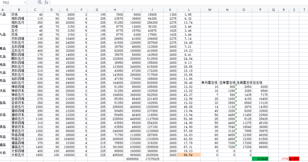 无极仙途 丹药、洗髓、忘忧,数据整理最近在攒洗髓,顺便把丹药的一些数据整理了下:把目前所有丹药洗满,需要51025个洗髓;每天换40个的话,需要三年半时间。单个洗髓获取最多属性的就是太极丹了,所以优先洗满太极丹,还不用自己练。其他的越高级性价比越高,但是由于忘忧的限制,导致后面无草炼丹。把除了太极丹的丹药洗满炼完,需要53w忘忧草;每天得300个的话,需要约五年时间。大致算了下,除了仙玉丹方,洗满可得总五约4000w(镇派加成按3倍粗略计算)。