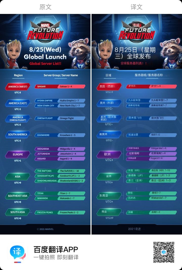 8月25日,惊奇漫画未来革命盛大发布!MARVEL Future Revolution团队刚刚分享了服务器列表和在即将到来的盛大发布后选择服务器时的一些重要注意事项,这将帮助您在最合适的游戏环境中体验游戏。*请注意,服务器将在未来日期按顺序添加。如有变更,将另行通知代理商。*区域和服务器已按颜色划分,以帮助您识别各自的时区。◆ 基于服务器的代理之间的游戏性和内容可用性1) 请注意,上表中