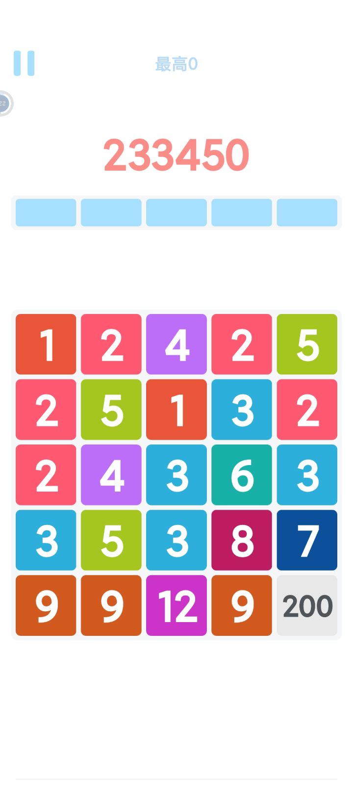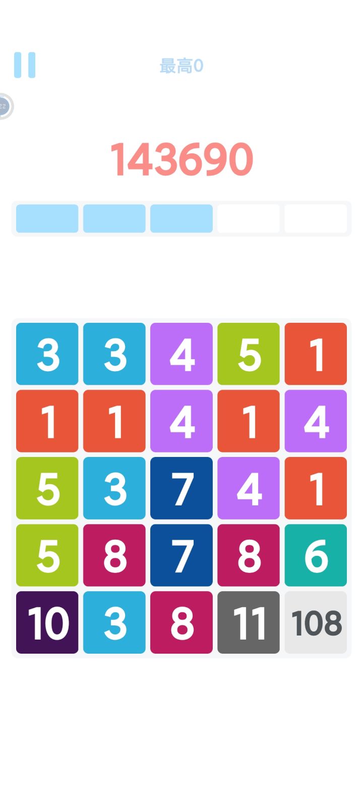 分享点小心得吧,也不算什么攻略1.步数、步数、步数。优先关注步数而不是分数,活着最重要。2.不必将步数太多浪费在5以下的数字上,能少点一次就省一步。系统出的数字最大是5,能让它们自动合并增加步数是最好的。3.尽量把大数堆放在左下角,优先往左下合并。自动合并的方向是从上到下、从右到左,所以右侧和上侧的小数字甚至可以不用过多关注,特别是5以内的,让它们自动往左下合并。4.警惕小数混在大数里。越