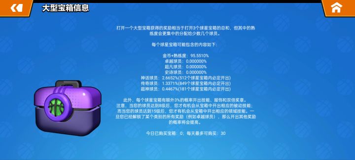 此帖是鉴于新手对球员的获得还有一些不清楚而写,这里就先写关于宝箱的。玩家从大厅左边点商店,然后划到最右边点那个紫色的宝箱(点宝箱不会直接购买的),之后点左上角的感叹号就会出现下面这幅图。(图)这就是对宝箱的介绍。注意:1:不同级别的球员保底是分开的,你出了一个神话球员,神话球员保底从头计算,其他的不变。2:一个紫色相当于开了三个绿色宝箱(球星宝箱),橙色相当于十个。3:之后想看自己的保底次数都可以按上述的方法自行查看。