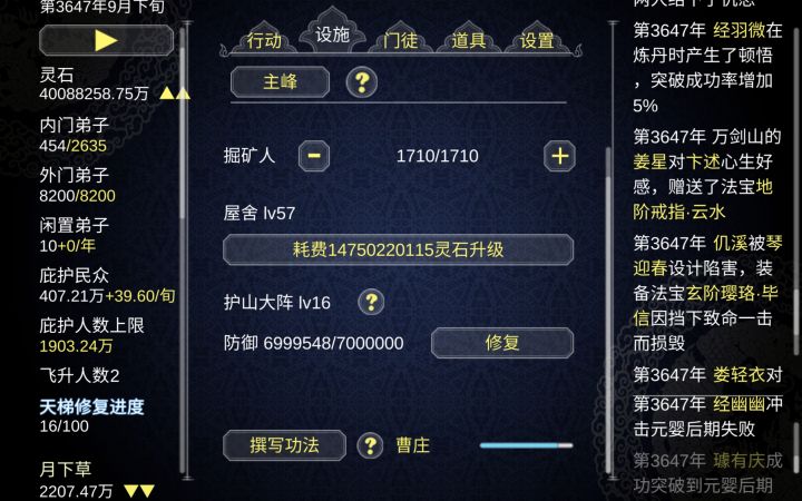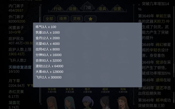 直接起飞。3600年,作为幕后黑手的我,每天唯一的工作是帮弟子修法宝,顺便让所有弟子磕满药,再搜刮下高级弟子的装备给低级的用